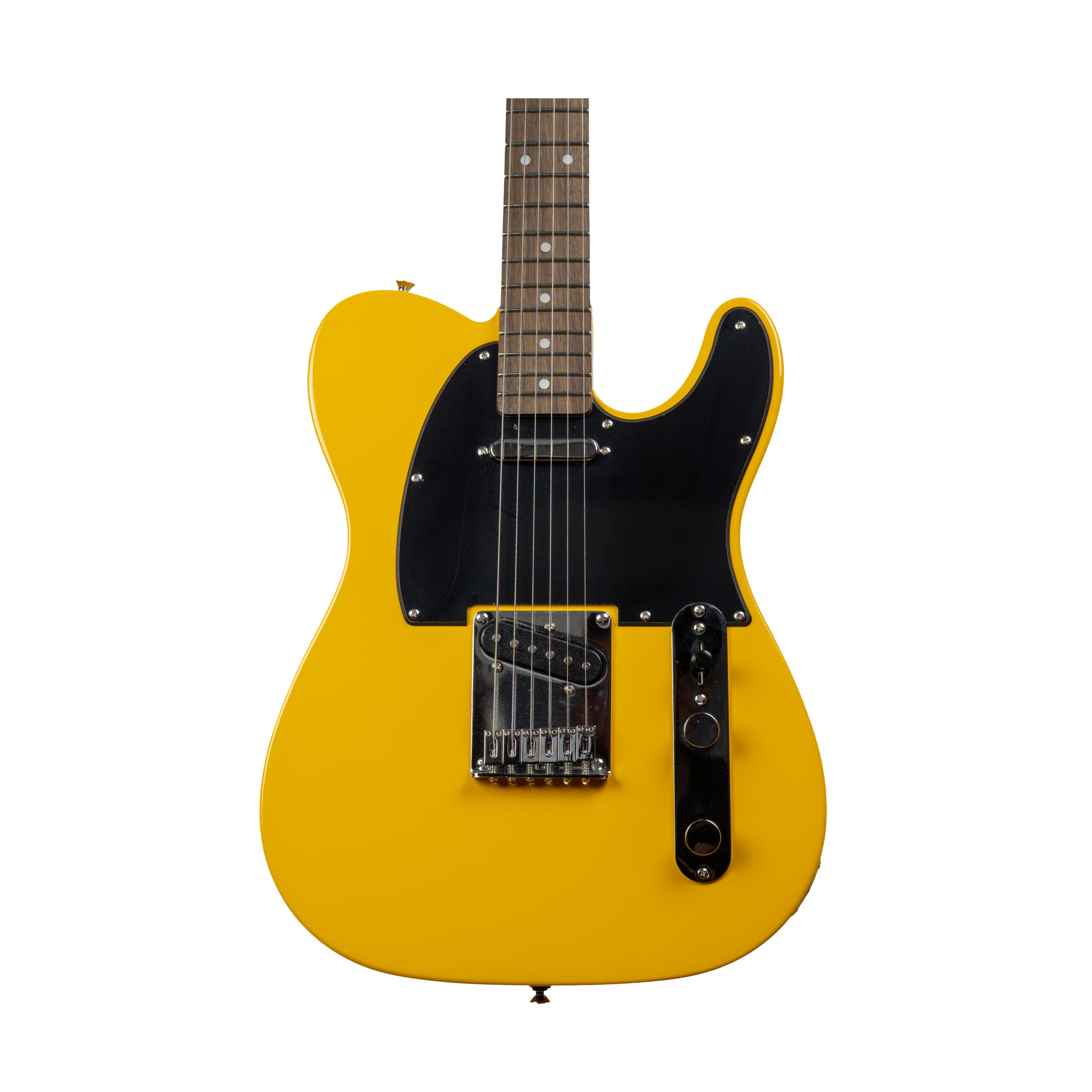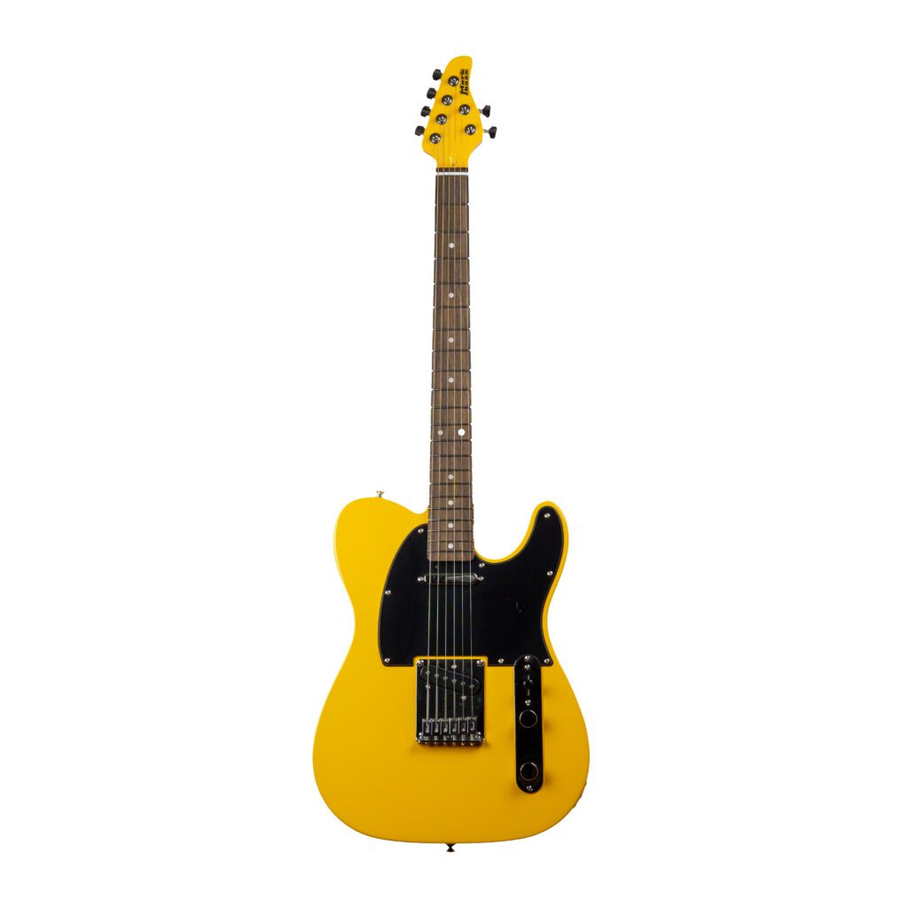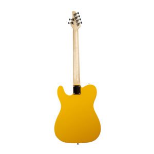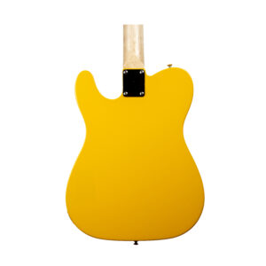 TL-style electric guitar, single-cutaway solid body, 4+2 headstock, 2 single-coil pickups “twang” tone, 3-way switch, fixed bridge, yellow finish, black pickguard.